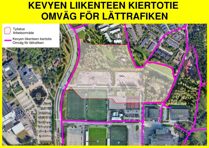 Ajoneuvoliikenteen kiertotie toteutetaan Orionintien kautta. Kevyen liikenteen reitti järjestetään työmaa-alueen länsipuolelta Koivu-Mankkaan tien reunassa.